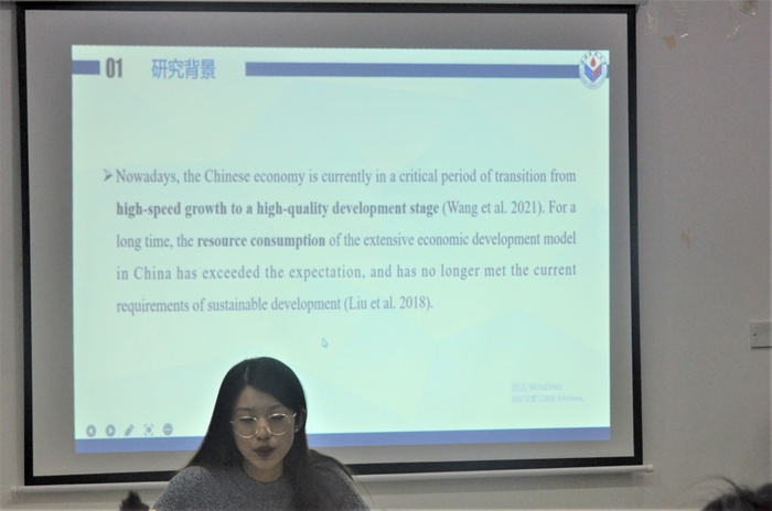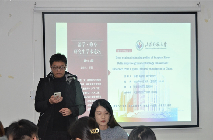 11月25日,商学院于长清湖校区文昌楼441教室成功举办“治学•修身”学术论坛。本次论坛的主讲嘉宾是商学院硕士研究生邱蕾,她以“区域规划、绿色技术进步与环境治理”为研究主题进行了精彩的学术演讲,学院部分研究生参加了此次论坛。