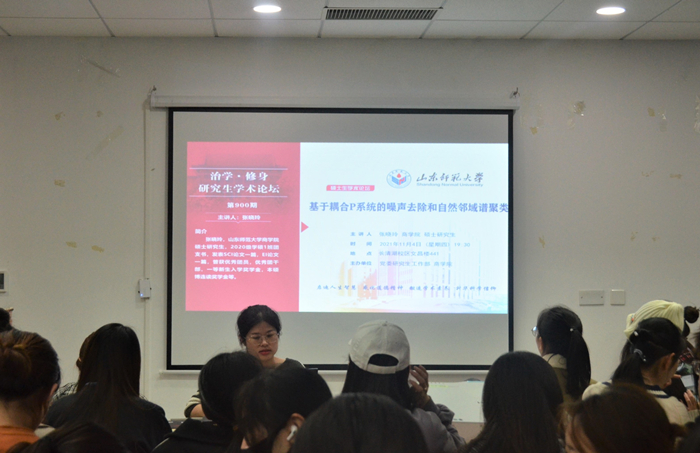 11月4日,商学院于长清湖校区文昌楼441教室成功举办“治学•修身”学术论坛。本次论坛的主讲嘉宾是商学院硕士研究生张晓玲,她以“基于耦合p系统的噪声去除和自然邻域谱聚类”为研究主题进行了精彩的学术演讲,学院百余名研究生参加了此次论坛。
