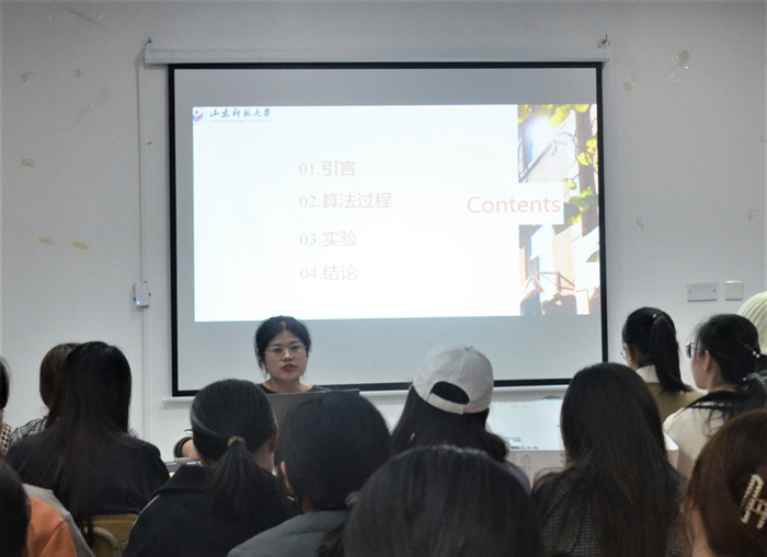 硕士研究生张晓玲分别从引言、算法过程、实验步骤以及实验结论四个方面展开详细论述。首先,她指出膜计算又称P系统是由Paun教授提出的具有分布式并行计算特点的系统,同时指出P系统的主要类型以及在理论研究解决实际问题上的意义。接着,她又指出聚类分析的相关概念以及噪声点是影响聚类分析效果的重要因素。然后,张晓玲同学向同学们详细讲解了谱聚类算法、自然邻域搜索算法、噪声搜索切割算法三类算法的输入输出过程,并依据算法流程向同学们展示了耦合P系统的基本结构,进而指出耦合P系统的形式化定义。