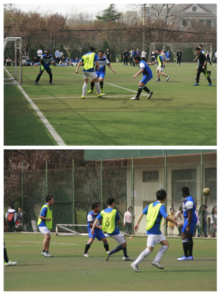正值正午,天气炎热如比赛盛况。本次足球赛有中国、韩国、乌兹别克斯坦、肯尼亚、几内亚比绍、老挝等多国运动员参与对战。在上半场的比赛中,国际教育学院队首先进行进攻,国际教育学院队员多为外籍学子,队员体型较为健硕。商学院队员尽量减少与对方的身体对抗,利用自身速度和默契配合组织了多次进攻。国际教育学院队则利用身型优势多次进行猛攻但都被商学院门将成芮弘阻拦,场外商学院学子纷纷呐喊助威,双方比赛陷入胶着。进入下半场时,商学院队韩国学子安周衡、孙志焕多次防守成功,中国学子刘忠题利用头球进行防守,破坏了对方的进攻计划。但因比赛进行到后程商学院队员体力消耗殆尽,队员奔跑速度明显下降,局势开始不利于商学院队。国际教育学院利用猛攻撕破商学院防线。最终,商学院惜败于国际教育学院队。赛后,商学院队与国际教育学院队进行友好互动。