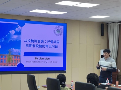 11月6日,韩国釜山大学长聘教授、博士生导师牟健教授受邀做客商学院,以“从投稿到发表:经管类国际期刊投稿的常见问题”为题开展学术讲座。报告会由学术副院长由雪梅教授主持,商学院五十余位师生代表参会,围绕经管类国际期刊选题、写作、投稿与科研伦理等问题展开深入交流。