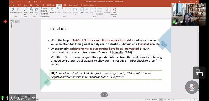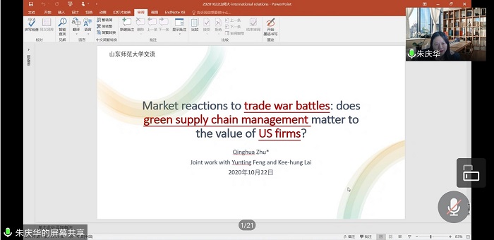 2020年10月22日上午8:30,商学院联合社会科学处主办的第1041期社科大讲坛在腾讯会议线上举行。讲坛由朱庆华教授主讲,做题为 “市场对贸易战争的反应,绿色供应链管理对美国公司的价值重要吗?”的报告。学院部分教师、研究生聆听了此次报告。