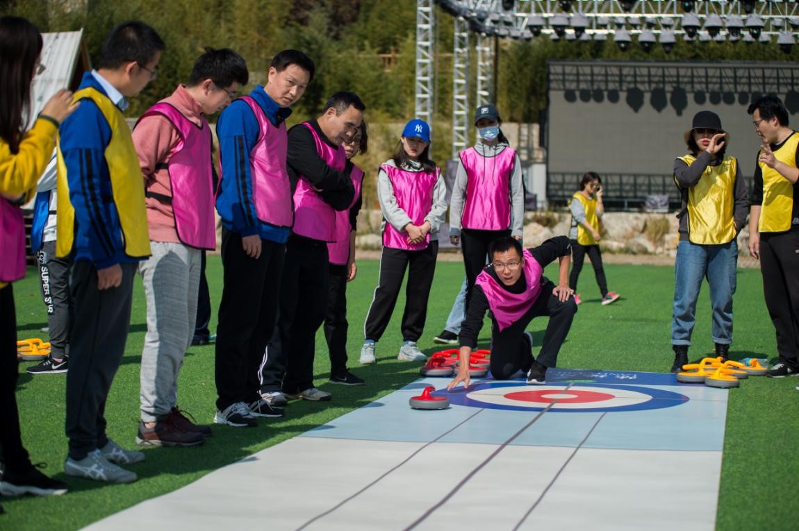 金秋时节,九如山层林尽染、景色宜人。上午10时,老师们来到拓展训练场,在教练带领下,分组进行陆地冰球比赛。各小组经过热烈讨论,别出心裁地亮明队名、队歌和团队口号,兴高彩烈地进行攻守竞赛。大家分工协作,各显神通,比出风格、赛出水平,尽享挑战的激情和成功的喜悦,赛场上气氛热烈,不时发出阵阵欢快笑声。