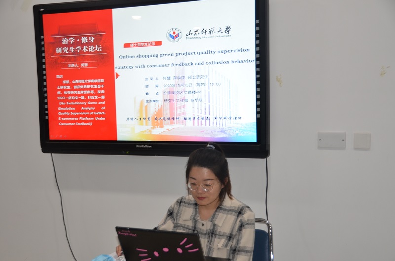 2020年10月15日晚7:00,商学院于长清湖校区文昌楼441教室成功举办研究生“治学·修身”学术论坛。论坛以“Online shopping green product quality supervision strategy with consumer feed back and collusion behavior”为主题,邀请了2018级研究生何慧作为主讲人,商学院四十余名研究生参加了此次论坛。