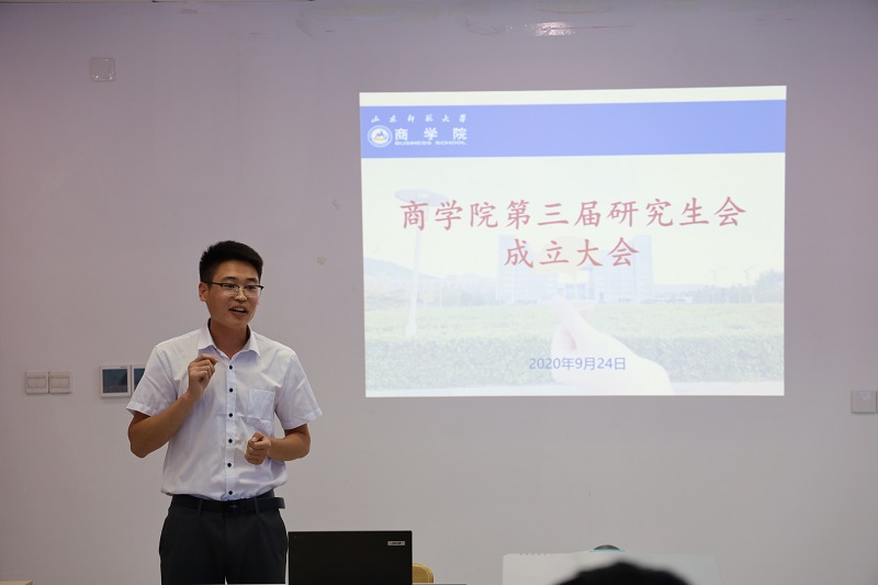 2020年9月24日12:30,商学院于长清湖校区文昌楼541教室成功举办第三届研究生会成立大会。会议邀请了郝宁宁书记、隋志强老师以及国凤祥老师出席,商学院第三届研究生会全体成员参加了此次会议。