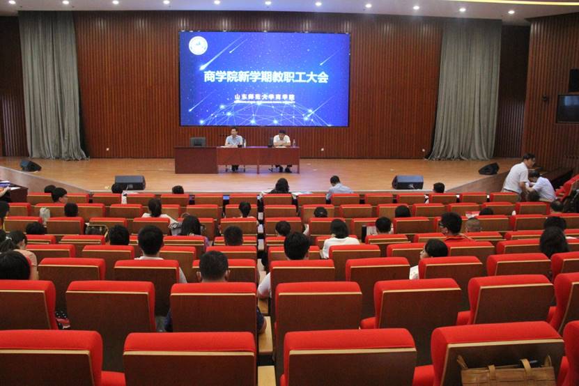8月28日,商学院于长清湖校区文昌楼105举办新学期教职工大会。商学院党委书记魏成武、院长夏同水出席会议,商学院全体教职工积极参与。