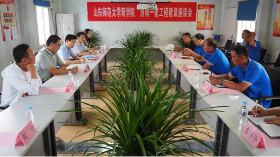 6月24日上午,由商学院与济南一建联合举办的“迎七一”互学共建座谈会,在长清校区教学实验综合楼工程项目部会议室召开。基建处处长杨连友、副处长冯安荣,商学院党委书记魏成武、副书记陈钊及院工会、团委负责同志,济南一建第三党支部书记、经理黄公洋,综合楼项目部现场经理朱铁、预算经理张守峰、劳务经理惠得华参加会议。