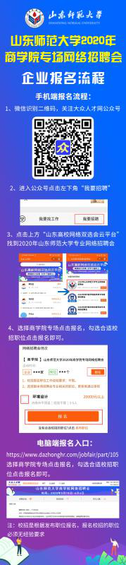 手机报名入口:手机微信搜索关注“大众人才网”微信公众号,企业和个人分别点击底部相关菜单按钮,进入大众人才网“山东高校网络双选会云平台”山东师范大学2020年商学院专场网络招聘会报名即可。