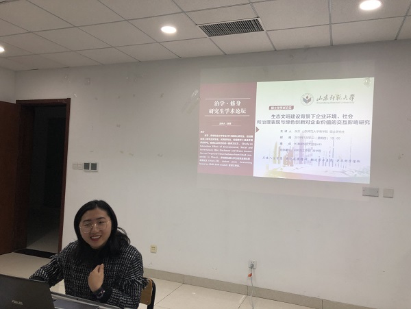 本次论坛张芬将讲解分为具体六个部分,详细为参会同学介绍了自己的研究内容,论坛中,张芬指出我国现已全面步入了生态文明发展的新时代,企业作为生态文明建设的主力军,在新的时代应以生态文明为导向,实现绿色兴国。同时,张芬在多个方面对生态文明建设,企业环境,社会等进行交叉分析,使参会人员进一步了解其研究内容。论坛最后一部分,张芬对该研究主题提出了建设性的政策建议,增强了研究内容的完整性和实用性。