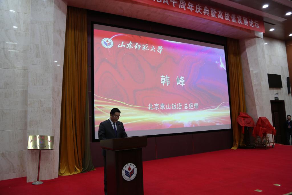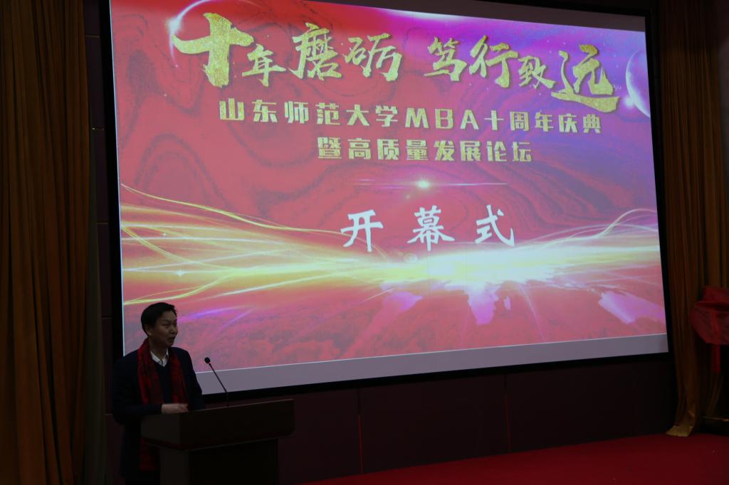 12月7日,山东师范大学商学院、MBA教育中心隆重举行了山东师范大学MBA十周年庆典暨高质量发展论坛。活动分为开幕式、论坛和参观座谈三个环节。山东师范大学副校长王传奎,山东省文化与旅游产业厅副厅长张明池,全国工商管理教指委委员、河南大学商学院院长王性玉教授,全国MBA教指委委员、东南大学经管学院李东教授,中文系93级校友、阿里巴巴合伙人、集团市场公关委员会主席王帅先生,山东大学MBA教育中心副主任刘冰教授,山东财经大学MBA学院院长陈宝启教授,MBA合作导师等嘉宾出席,MBA历届校友、任课教师、校内导师、在校生参加了庆典和论坛。