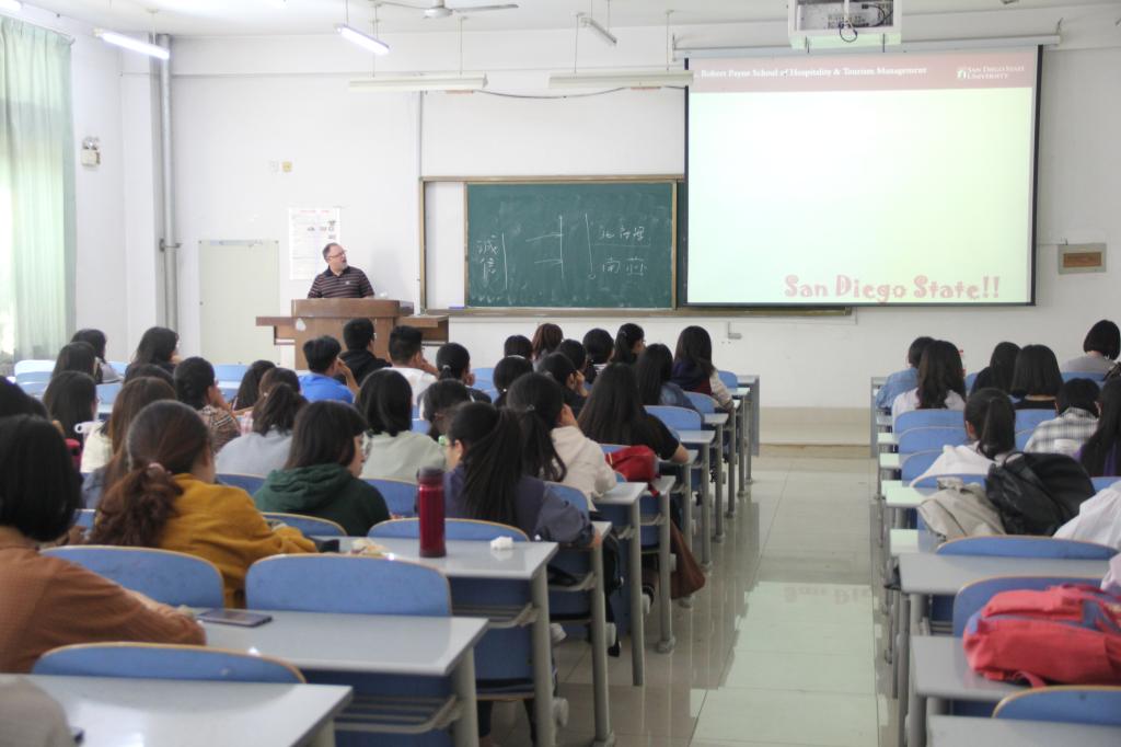 9月27日,商学院于长清湖校区文渊楼C区108教室开展美国圣地亚哥州立大学学生交流项目宣讲会。本次宣讲会由美国圣地亚哥州立大学国际项目主任布莱恩·布莱克担任主讲,2017级、2018级百余名学生积极到场聆听学习。