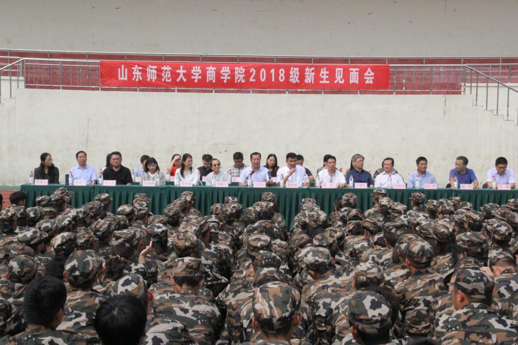9月14日,商学院于长清湖校区风雨田径场举办2018级新生见面会。商学院党委书记王发科,常务副院长夏同水,党委副书记陈钊、黄春霞,韩方院长李鹤圭,副院长于绥生、刘丽娜、刘凤鸣出席此次新生见面会,学工办主任、团委书记郝宁宁,院长助理,各学科系主任,学院教师代表,全体辅导员以及2018级631名新生到场参加了见面会。此次见面会由陈钊主持。