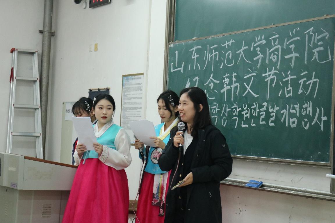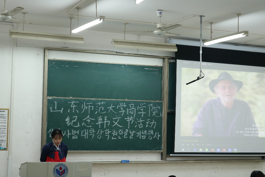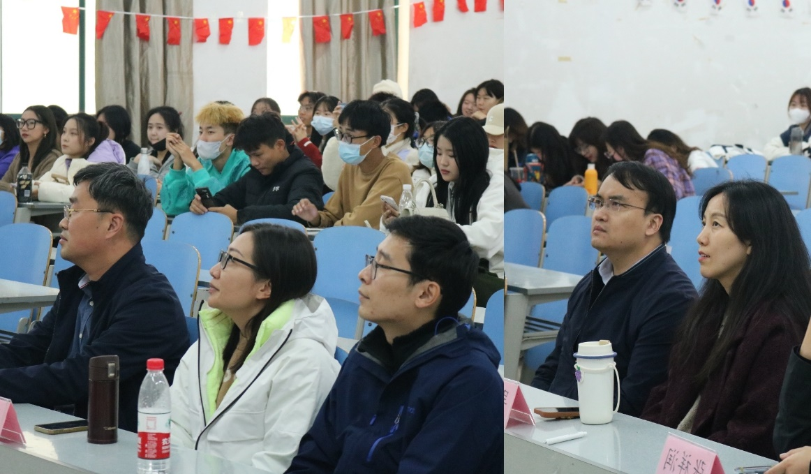 11月17日,商学院于文渊楼C区117教室举办纪念韩文节活动,商学院副院长刘钻扩,院长助理肖丁丁、中外合作部主任李斐斐、物流管理专业负责人吴梦娜以及2021级、2022级商学院学生出席活动,此外,韩方院长李鹤圭以及高民子等6名韩语教师线上参与此次活动。