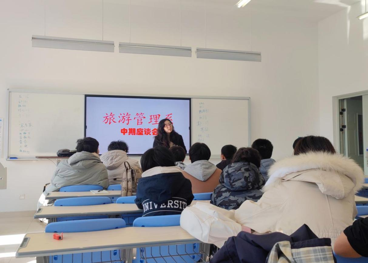 为全面了解同学们本学期的学习及生活状况。进一步提升教学工作质量。商学院旅游管理系于11月15日中午举办学期中期座谈会,会议由旅游管理系主任秦晓楠主持,旅游管理系各年级学生代表参会。