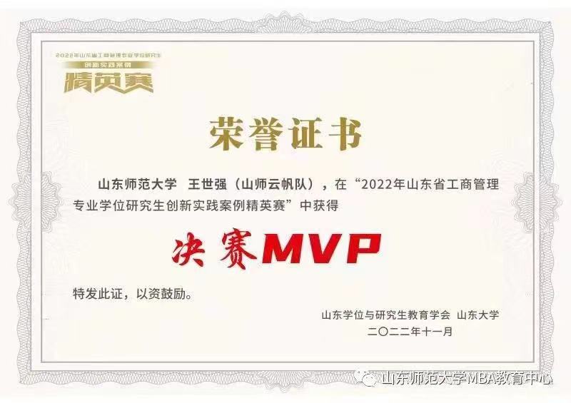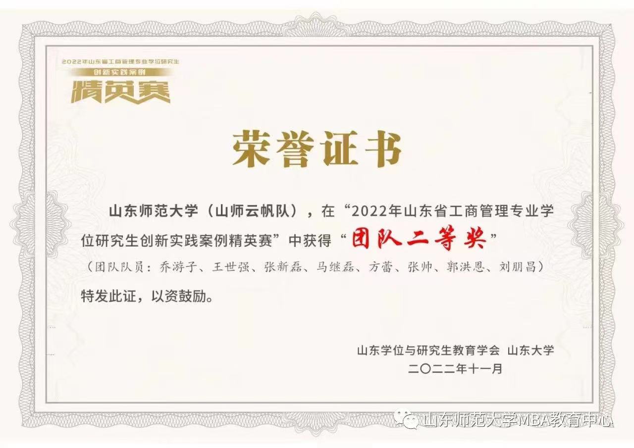 11月20日,2022年山东省工商管理专业学位研究生创新实践案例精英赛拉开帷幕,我校MBA教育中心选派“山师云帆队”参赛,最终荣获省赛二等奖,王世强获得MVP个人奖。本次比赛由朱仁奎教授对整个赛事过程进行了全程指导,乔游子、王世强、郭洪恩、马继磊、方蕾、张帅、张新磊、刘朋昌八名同学作为上场队员参加了比赛,王启龙同学针对海信的渠道问题进行了专业细致的指导,部分会计学专硕学生参与了案例相关工作。