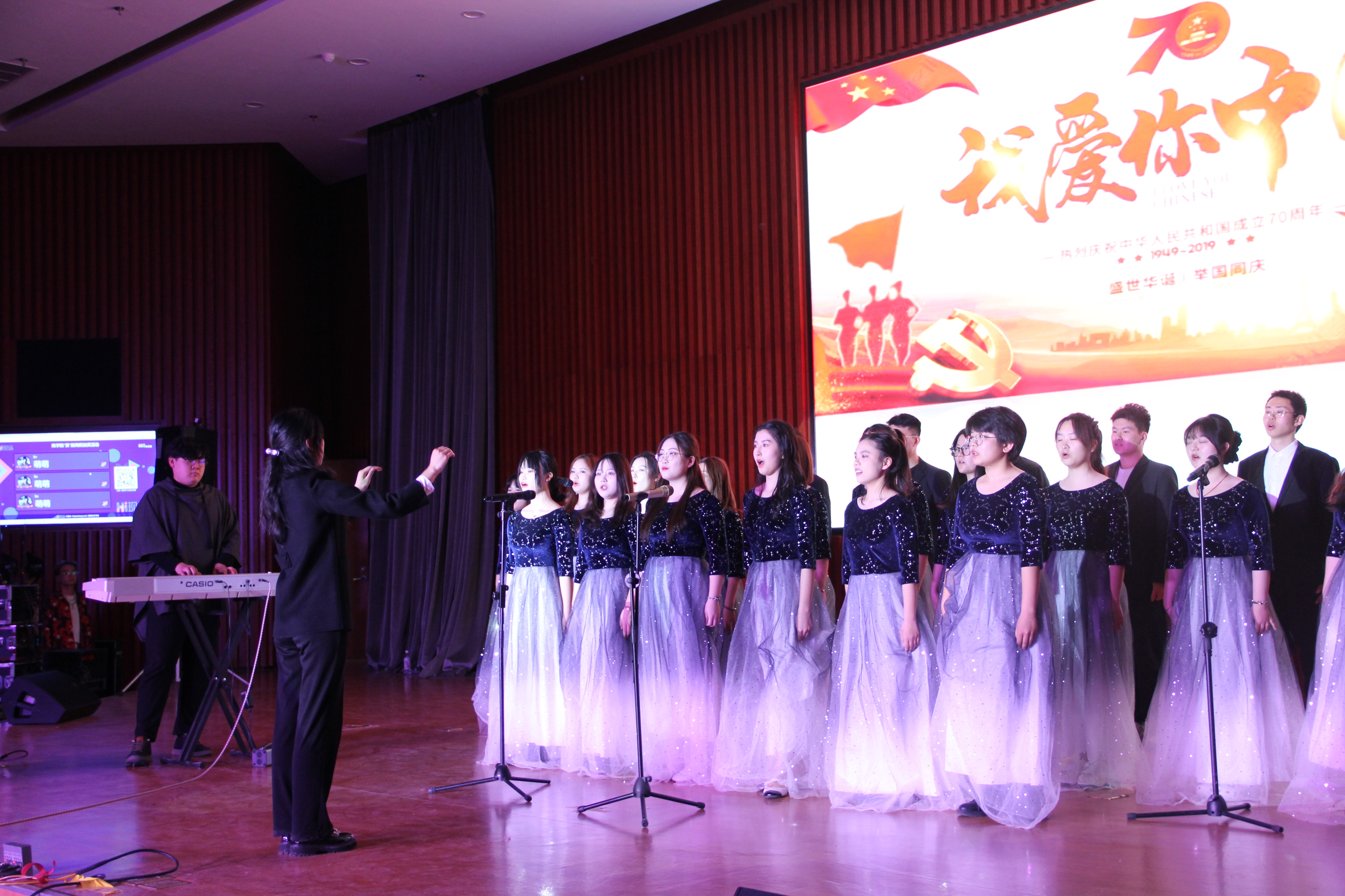 各社团带来的歌舞器乐演奏与易班上墙抽奖活动相互穿插,全面调动了观众的积极性,最后的合唱《我爱你中国》歌声激昂澎湃,唱出了爱国情,唱出了幸福感。