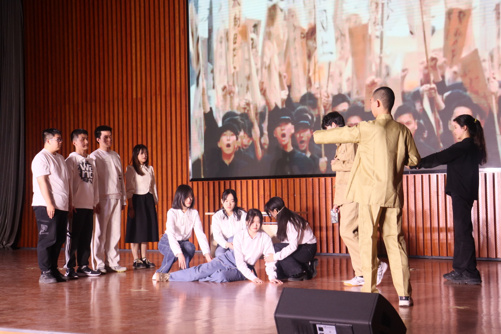 经过两个月的精心排练,本届话剧节的表演者为观众呈现了一场精彩绝伦的视听盛宴。活动由开场舞蹈《nxde》拉开序幕,节奏感十足的舞步配合动感的背景音乐,瞬间点燃了现场气氛。话剧《觉醒青年》以巴黎和会中国外交失败为背景,分“愿得此身长报国,何须生入玉门关”“ 苟利国家生死以,岂因祸福避趋之” “北李南陈引风云,觉醒青年探路欣”三幕,演绎百年前中国青年的热血沸腾,表达对老一辈“先进青年”的崇高敬意,彰显新时代青年的青春活力;《风声》讲述抗战时期,伪政府高官频频遇刺,日寇设下圈套对中共地下组织进行搜查,中共地下分子在一系列周旋中隐藏身份、誓死捍卫情报的惊心动魄的故事,跌宕起伏的剧情深深地打动了现场观众,精彩的演出赢得了师生们的阵阵掌声。此外,话剧《放下手机 奋斗人生》情节设置精妙,讽刺了当下部分学生沉迷手机、懈怠学习的现象;诗朗诵《祖国放心强国有我》,朗诵人以饱满的热情、昂扬的姿态抒发了对党和国家的无限热爱,坚定地表达了永远跟党走的信念……