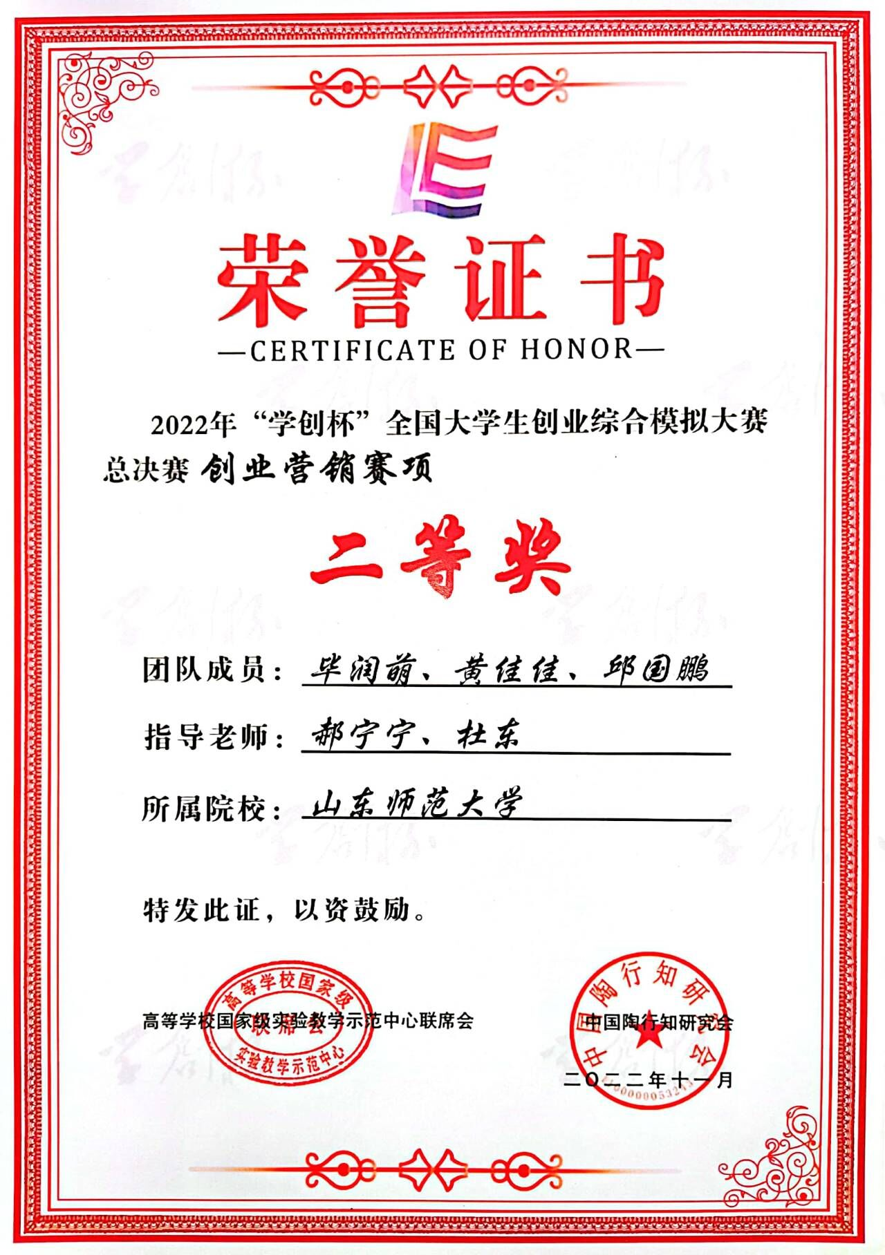 “学创杯”大学生创业综合模拟大赛是中国高等教育学会《高校竞赛评估与管理体系研究》确定的A类赛事。大赛旨在培养学生创新创业思维和创业经营分析决策实战能力学习、获得深刻的创新创业实战经验,激发学生探索创新精神、团队协作的精神。本次赛事我校学子参与营销专项赛道,整个决赛分为四个季度,每个季度的评分标准有三项,分别是:盈利表现、市场表现和成长表现,取最后一个季度的综合成绩排名作为最终的排名。根据疫情防控需要,本次国赛采用线上全程监控的方式举行,来自1458所高校的30余万师生在“云端”展开了对决。备赛期间,杜东、郝宁宁作为指导教师,时刻关注比赛信息,全程跟进团队动态,进行多方面指导。毕润萌、黄佳佳、邱国鹏认真备赛,积极配合,克难奋进,根据市场上瞬息万变的情况进行快速的判断,不断调整营销策略,进一步改良产品,使自己企业的盈利水平稳步提升,企业不断成长壮大,在激烈的比赛中脱颖而出,取得佳绩。