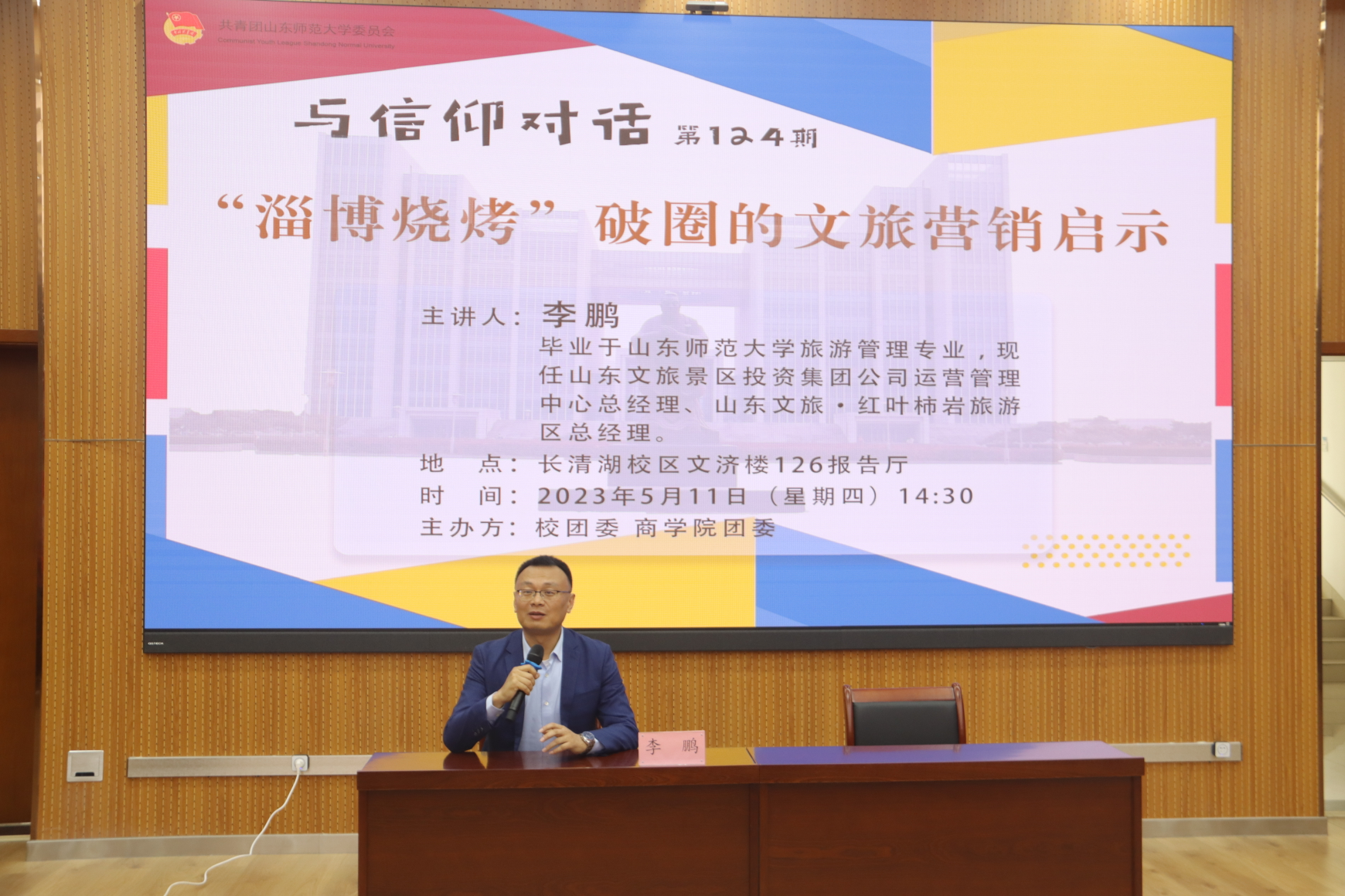 5月11日,校团委与商学院团委联合举办的“‘淄博烧烤’破圈的文旅营销启示”主题讲座于长清湖校区文济楼126报告厅开展。本次讲座由山东文旅景区投资集团公司运营管理中心总经理、山东文旅·红叶柿岩旅游区总经理李鹏主讲,商学院旅游管理专业全体学生积极参与。