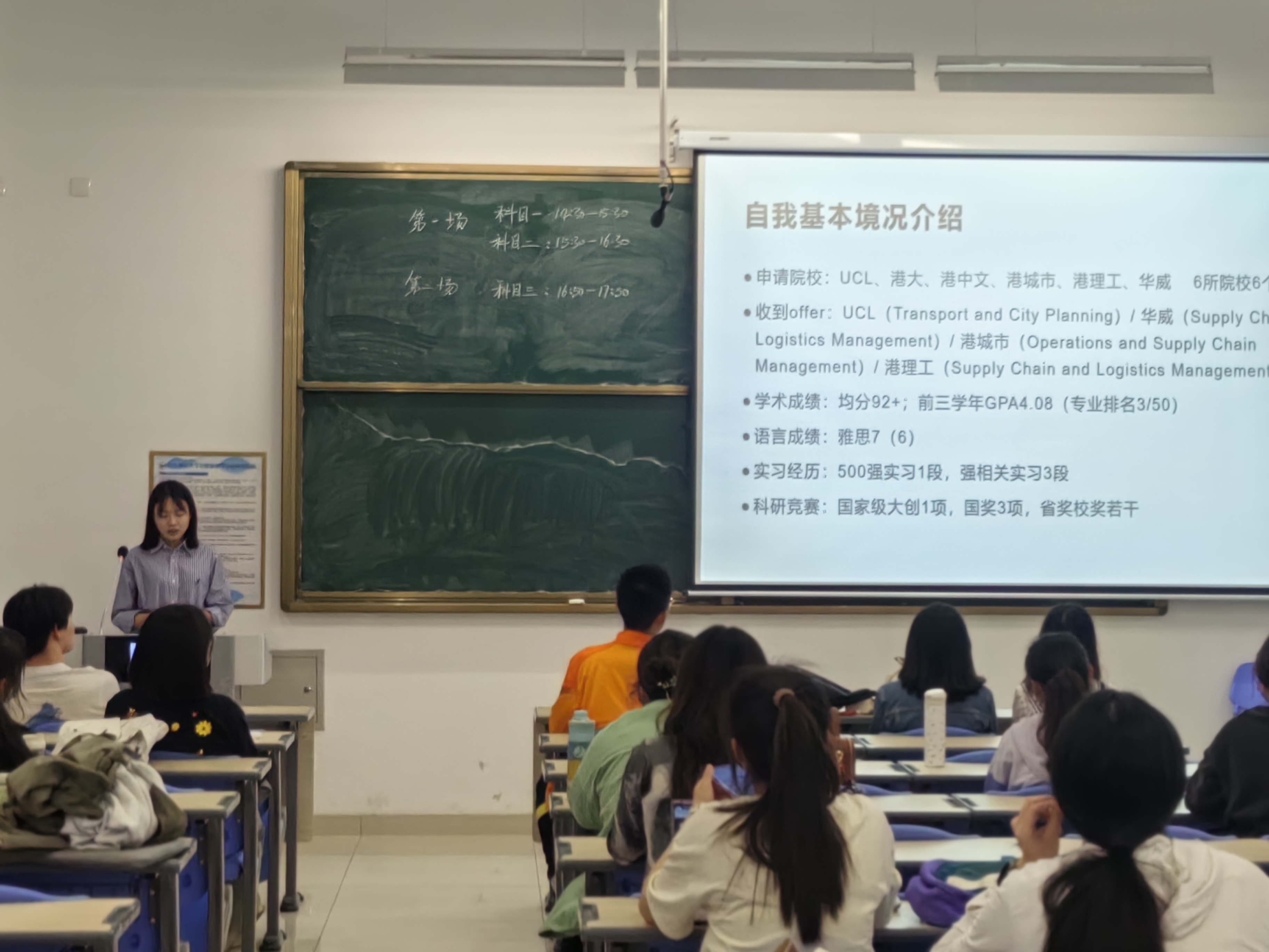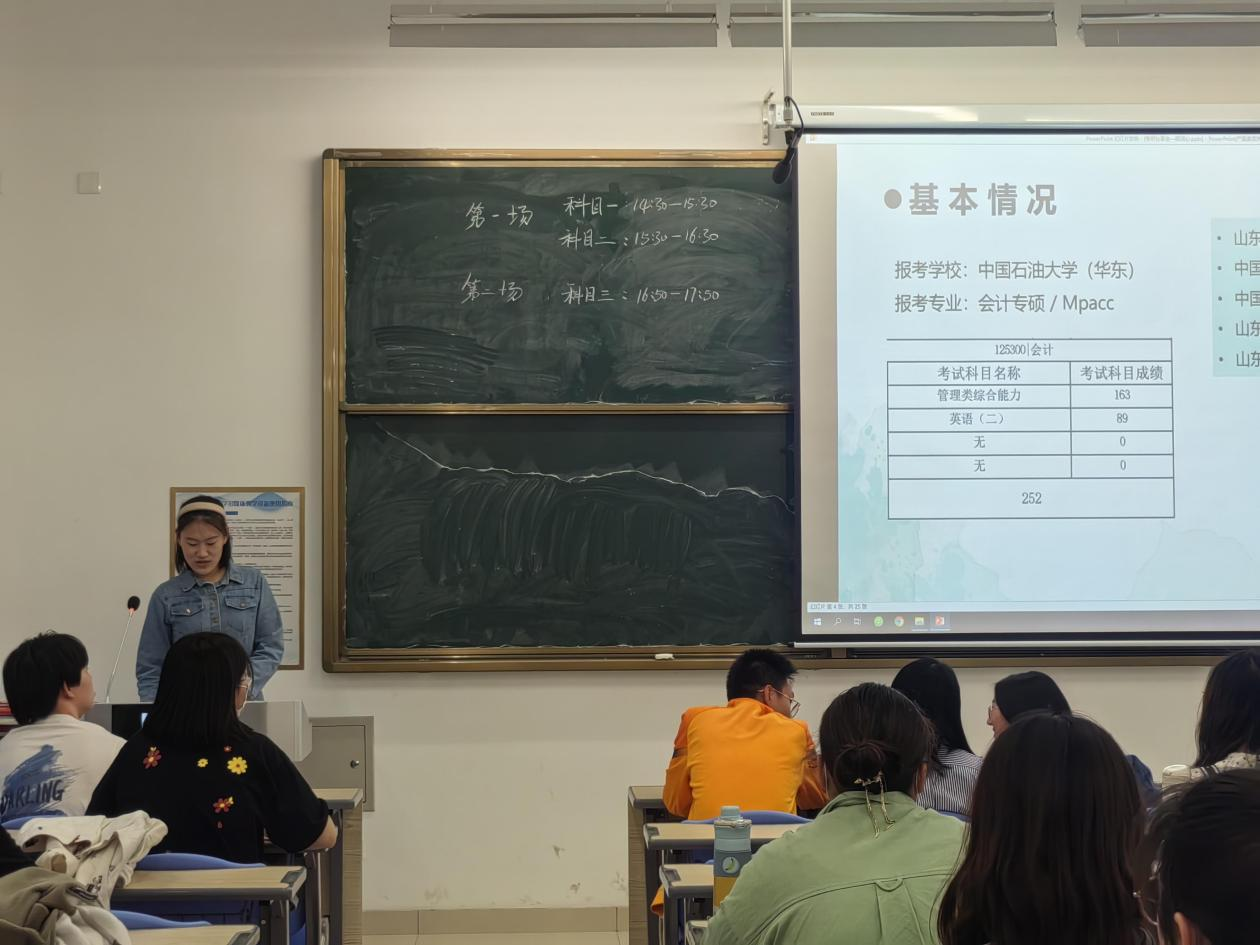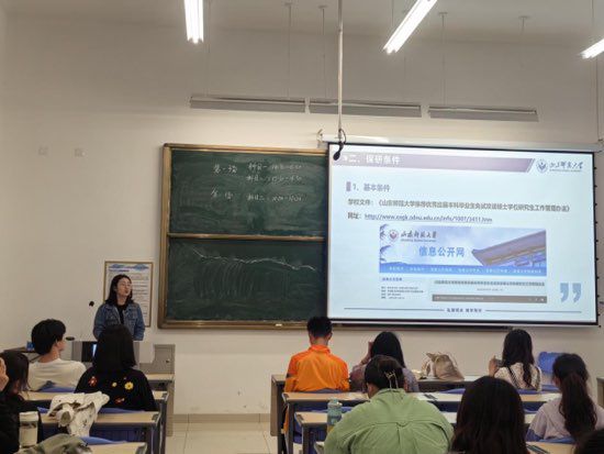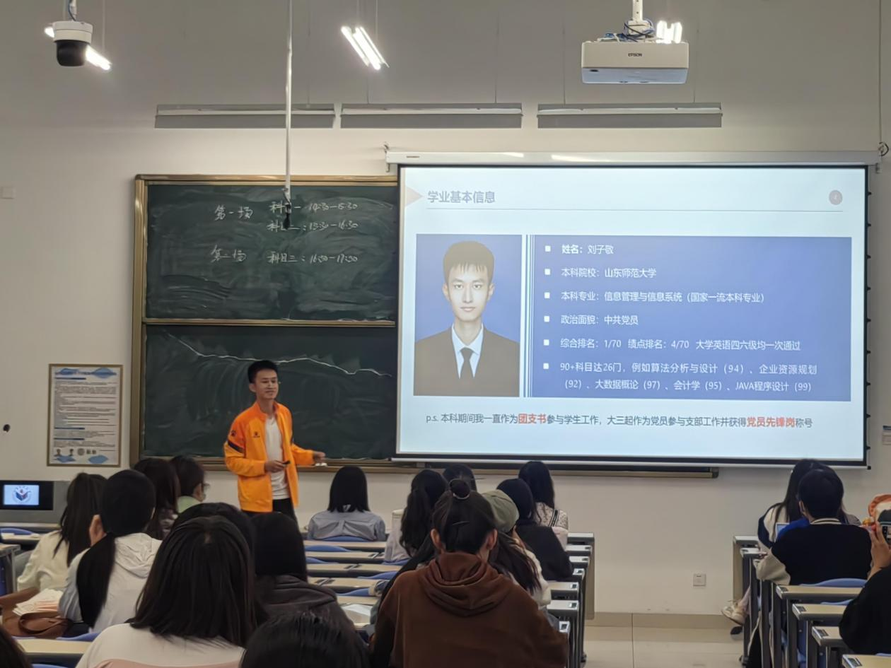 仲瑾熠和刘子敬以自身保研经历为例,具体从保研流程及保研条件两个方面为同学们进行了经验分享。仲瑾熠详细介绍了综合成绩计算方法和推免流程。她告诉大家要调整好心态,早做决断,坚定信念,拒绝躺平,和焦虑握手言和。刘子敬讲述了自己获得推免资格的经历,向大家介绍了本科期间的个人发展规划、相关学科竞赛情况,就生涯规划和发展方向选择等问题为同学们提供了参考建议。