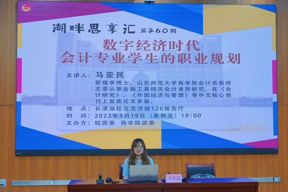 5月19日,校团委与商学院团委于长清湖校区文济楼126报告厅联合举办了“湖畔思享汇之数字经济时代会计专业学生的职业规划”讲座。会议由管理学博士马亚民担任主讲人,商学院2022级百余名学生到场参加。