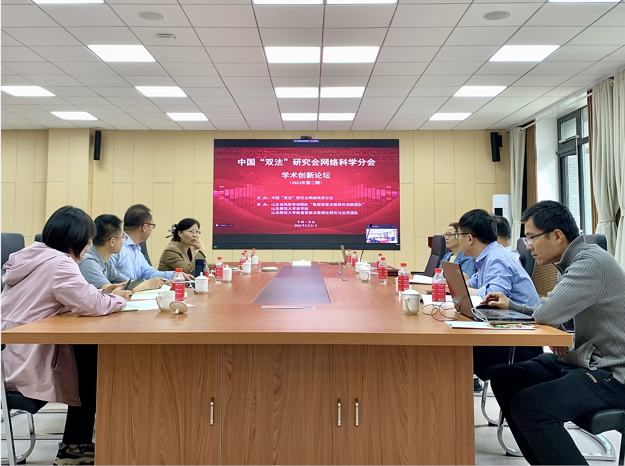 5月21日,由中国优选法统筹法与经济数学研究会网络科学分会主办,山东省高校青创团队“数据智能决策研究创新团队”、山东师范大学商学院、山东师范大学数据智能决策理论研究与应用团队共同承办的中国“双法”研究会网络科学分会2023年第二期学术创新论坛在文济楼549会议室举行,并同时在腾讯会议面向网络科学分会成员在线直播。山东大学管理学院党委书记孟庆春教授、山东大学数学学院冯俊娥教授、北京师范大学柯李博士、山东大学包春兵博士、商学院部分老师与研究生共计三十余人出席会议,学术论坛由马英红教授和刘伦博士主持。