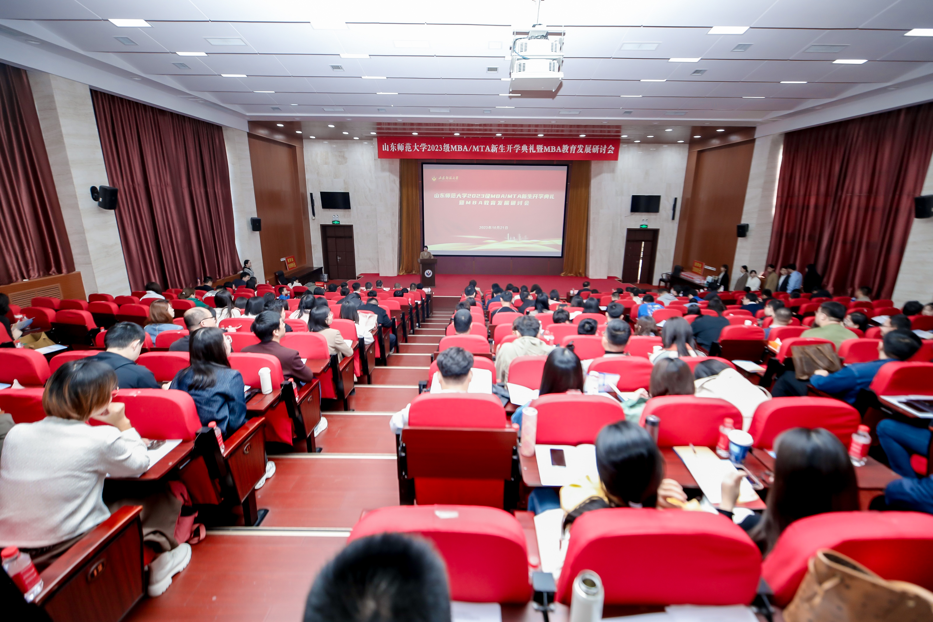 2023年10月21日,山东师范大学2023级MBA/MTA新生开学典礼暨MBA教育发展研讨会在千佛山校区三号楼报告厅圆满举行。山东师范大学党委常委、副校长周珊珊教授,全国MBA教育指导委员会秘书处办公室主任王萍教授,MBA教育知名专家学者应邀出席,商学院师生参加。典礼由商学院院长、MBA教育中心主任马英红教授主持。