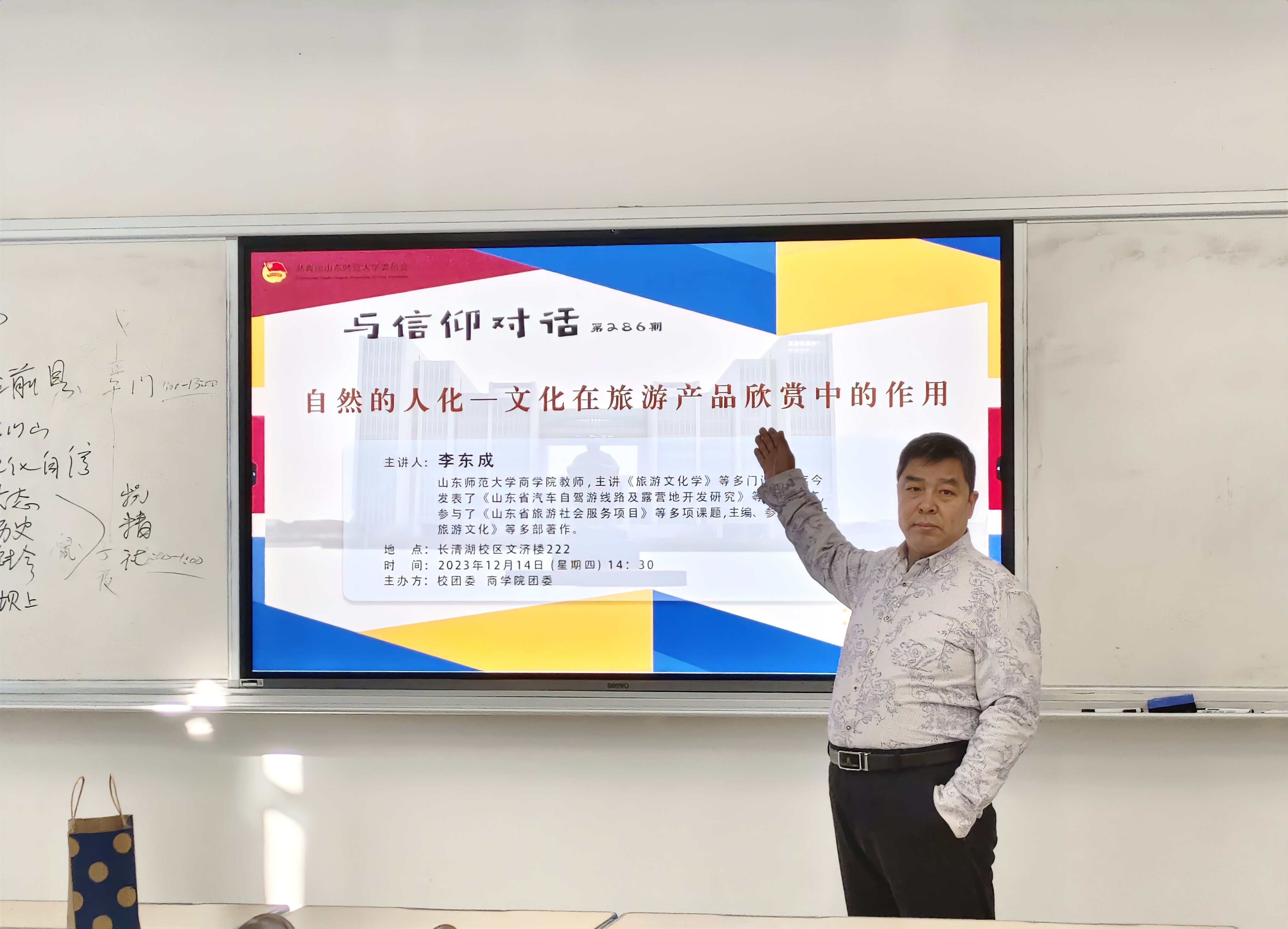 12月14日,校团委与商学院团委联合举办的“自然的人化——文化在旅游产品欣赏中的作用 ”与信仰对话讲座于长清湖校区文济楼222进行。本次讲座由商学院旅游管理系的李东成担任主讲人,商学院百余名同学积极到场参加。