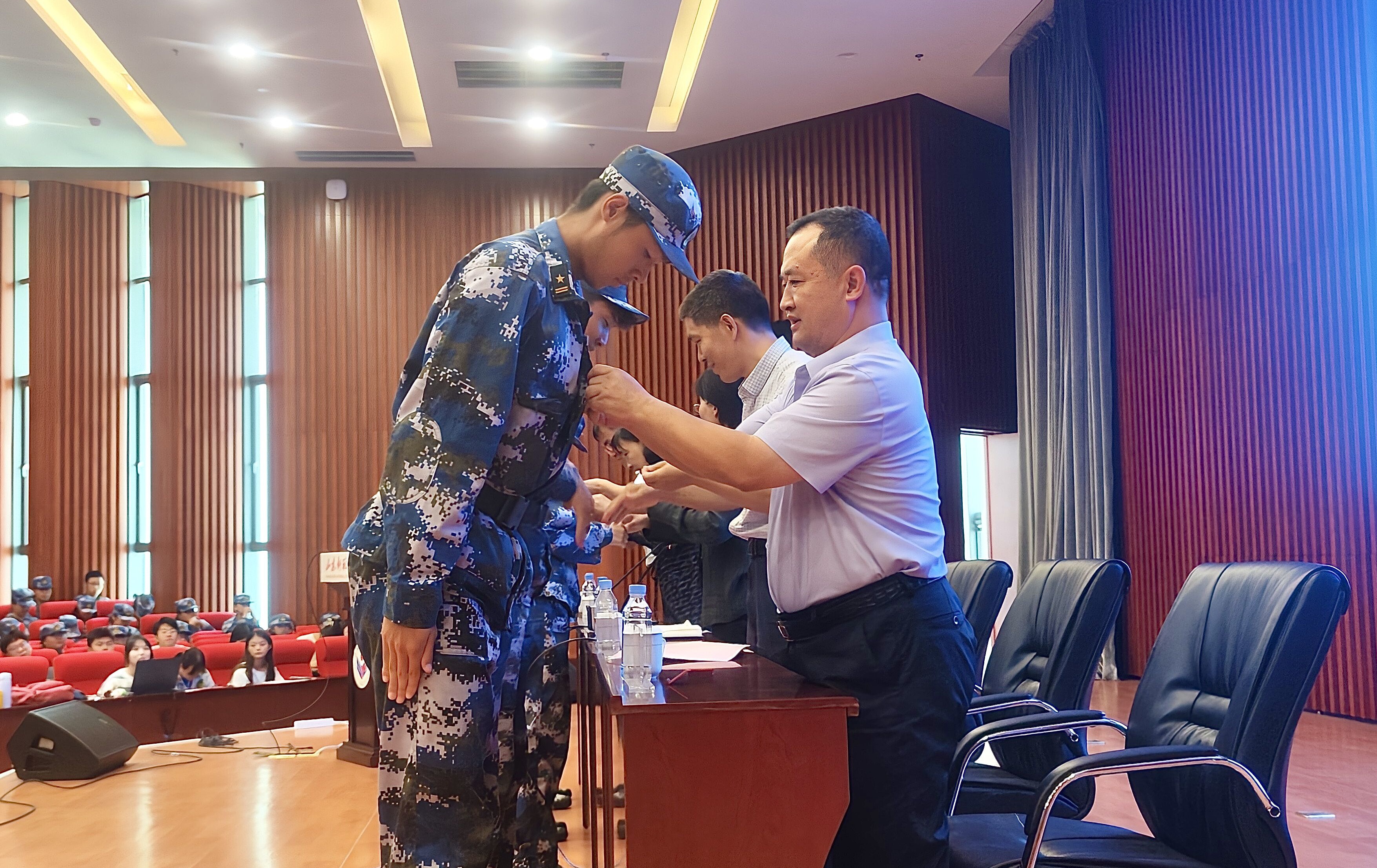 学院领导为新生代表佩戴校徽,他们希望同学们秉承“尊贤尚功、奋发有为”的校园精神和“弘德明智、博学笃行”的校训,寄语新生们不负青春,不负韶华。