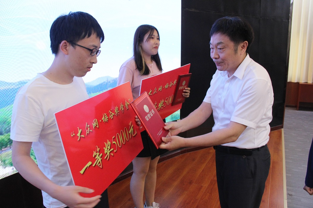 万光侠、林忠礼、李雪修、夏同水分别为“大众•梅谷奖学金”获得者颁奖并合影留念。